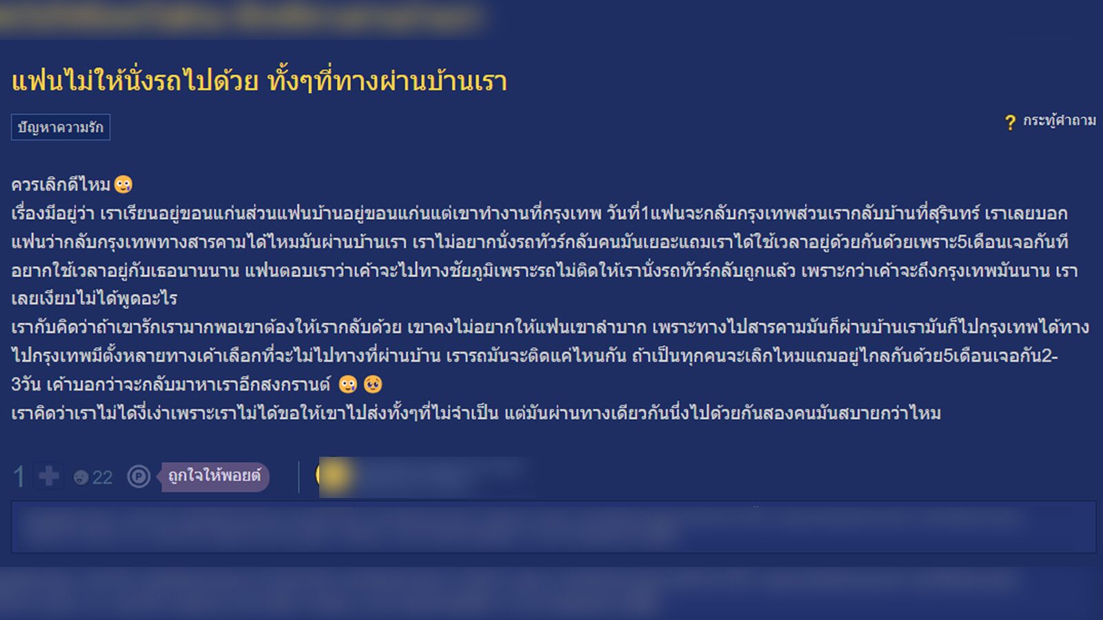 หลังจากได้ยินคำพูดของแฟนหนุ่ม เธอได้แต่เงียบและคิดทบทวนว่า ถ้าแฟนรักเธอมากพอ เขาควรให้เธอติดรถกลับด้วย ไม่ควรให้แฟนต้องลำบากนั่งรถทัวร์ อีกทั้งการไปกรุงเทพฯมีหลายเส้นทาง แต่เขากลับเลือกที่ไปทางที่ไม่ผ่านบ้านของเธอ จึงอยากถามทุกคนว่าถ้าเจอสถานการณ์เช่นนี้จะเลิกกับแฟนหรือไม่?