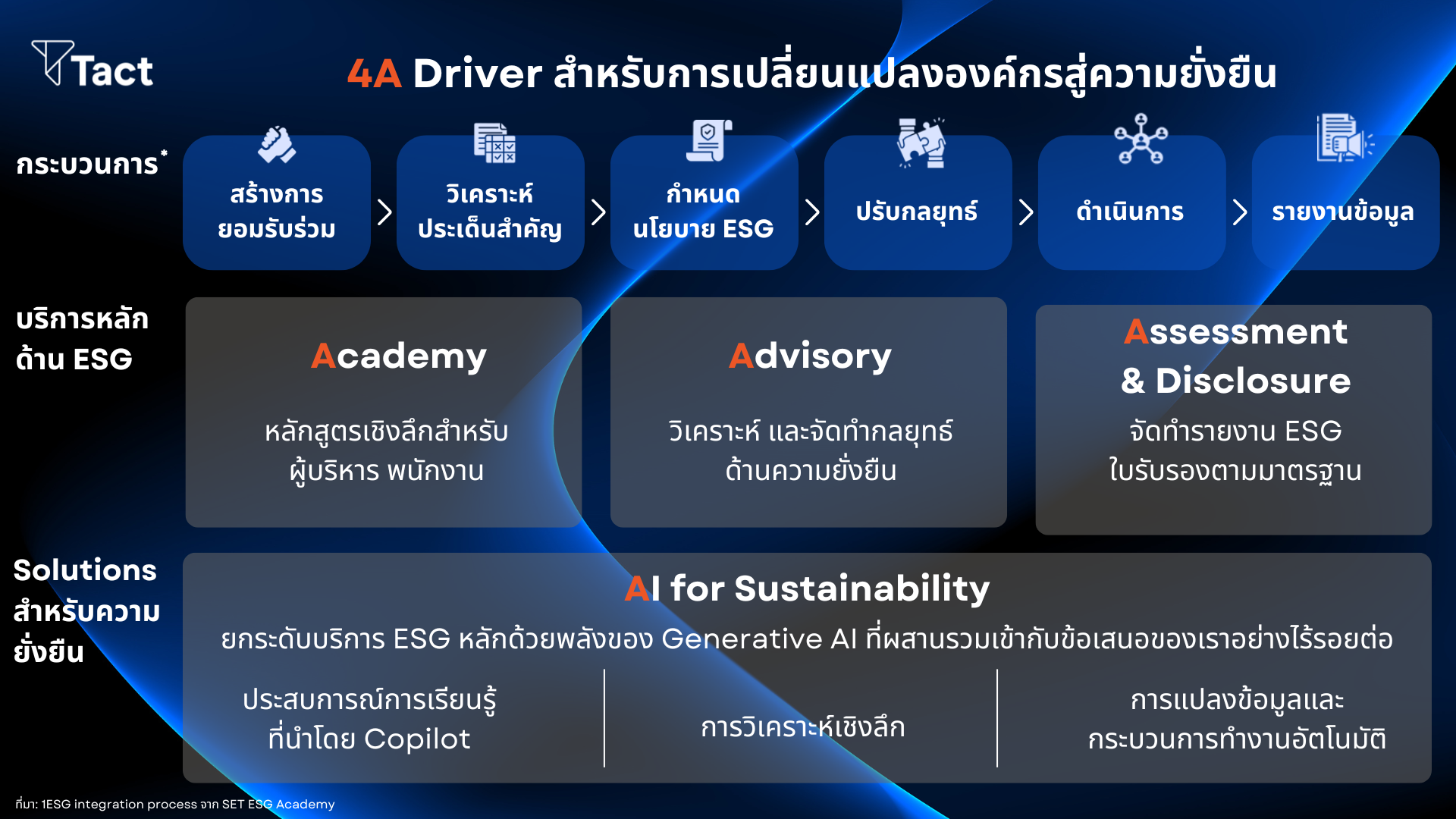 Tact เริ่มก่อตั้งตั้งแต่ปี 2561 ด้วยวิสัยทัศน์ที่ว่า “Driving Sustainable Transformation” ทำให้ Tact มุ่งมั่นที่จะเป็นพันธมิตรในการช่วยผลักดันให้ภาคธุรกิจสามารถเปลี่ยนผ่านสู่องค์กรที่ยังยืนได้ ผ่านการให้บริการที่ปรึกษาด้านความยั่งยืน ช่วยองค์กรในการวางกลยุทธ์และดำเนินโครงการที่เป็นแนวทางแก้ปัญหาที่กระทบต่อสังคมและสิ่งแวดล้อมให้บรรลุตามที่องค์กรเป้าหมายที่ตั้งไว้