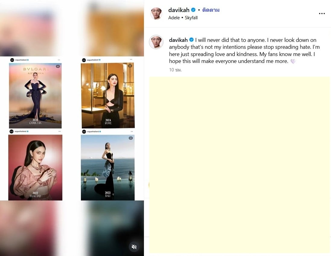 พร้อมกันนี้ยังได้ระบุข้อความซึ่งมีความหมายว่า “ฉันจะไม่ทําแบบนั้นกับใคร ฉันไม่เคยดูถูกใคร โปรดหยุดเผยแพร่ความเกลียดชัง ฉันมีแต่ความรักความเมตตา แฟน ๆ ของฉันรู้จักฉันดี ฉันหวังว่าสิ่งนี้จะทําให้ทุกคนเข้าใจฉันมากขึ้น “