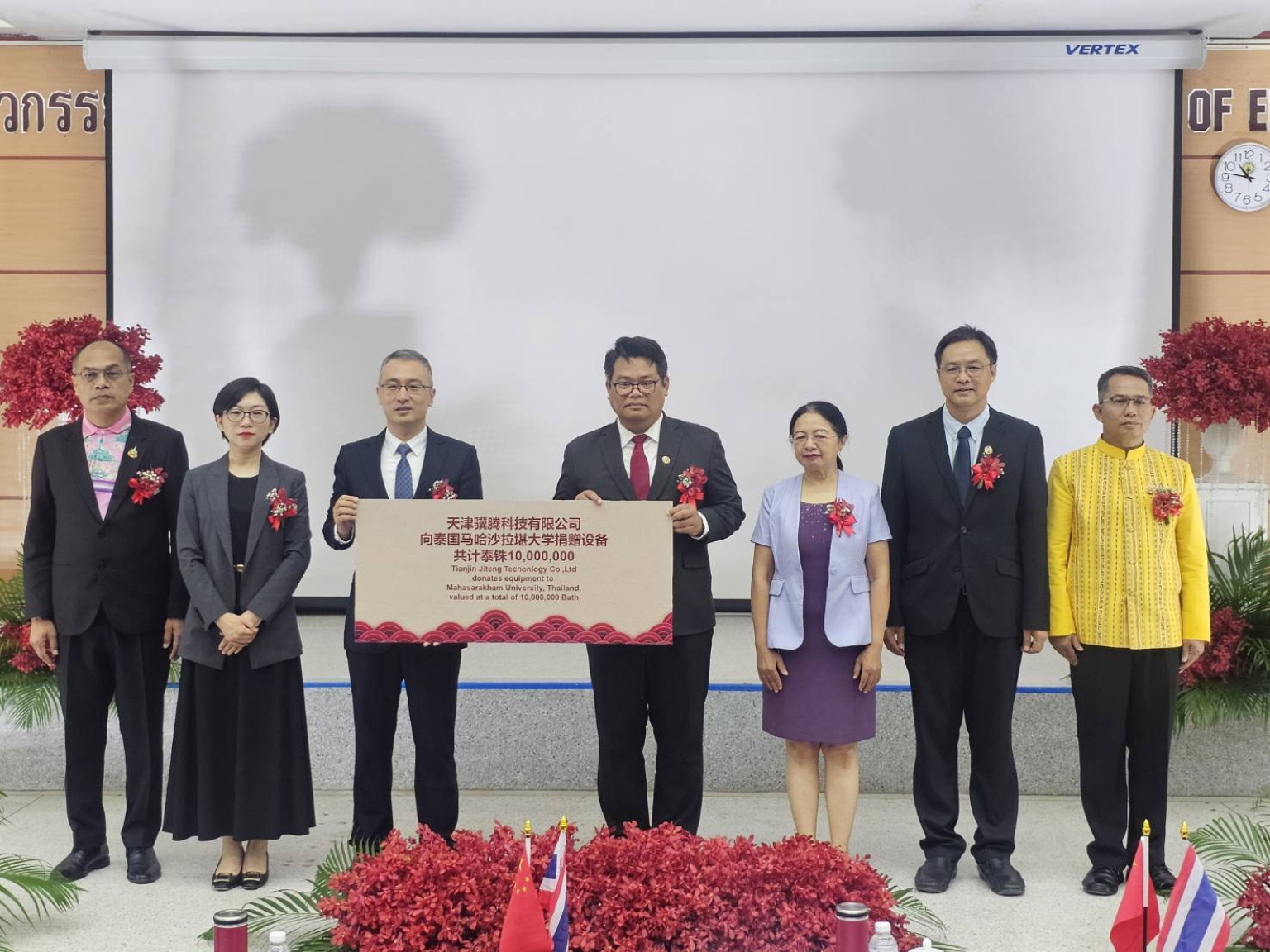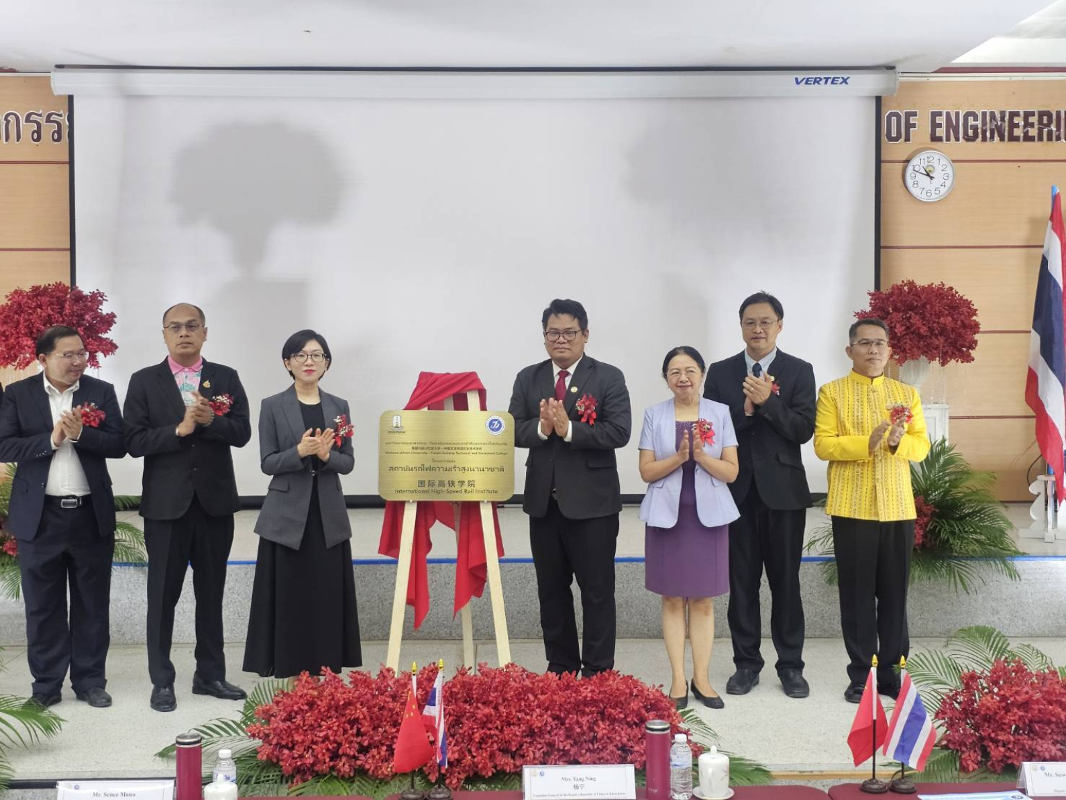 ด้านนายสุวรรธณ์ เข็มธนเพ็ชร รองผู้ว่าราชการจังหวัดร้อยเอ็ด กล่าวว่า ขอขอบคุณคณะวิศวกรรมศาสตร์ มหาวิทยาลัยมหาสารคาม ที่ได้เล็งเห็นถึงศักยภาพของจังหวัดร้อยเอ็ด ในการเป็นฐานสําคัญของการพัฒนาอุตสาหกรรมระบบรางในภูมิภาคตะวันออกเฉียงเหนือ โดยเฉพาะด้านการศึกษา การฝึกอบรม และการพัฒนาทักษะด้านเทคนิคขั้นสูง อันจะเป็นประโยชน์ต่อการพัฒนาทักษะวิชาชีพของลูกหลานของชาวจังหวัดร้อยเอ็ด และจังหวัดใกล้เคียงให้มีความพร้อมในการรองรับเทคโนโลยีระบบรางขั้นสูงของประเทศในอนาคต ซึ่งจะเป็นรากฐานที่มั่นคงในการรองรับโครงการระบบรางในระดับชาติ และอาเซียน โดยโครงการการจัดตั้งสถาบันรถไฟความเร็วสูงนานาชาติแห่งนี้ จะเป็นแรงผลักดันสำคัญในการพัฒนาเครือข่ายความร่วมมือด้านการศึกษา เทคโนโลยี และอุตสาหกรรม ระบบรางระหว่างไทย-จีน และเป็นต้นแบบของความร่วมมือที่สามารถขยายผลไปสู่ประเทศอื่น ๆ ใน อนาคต