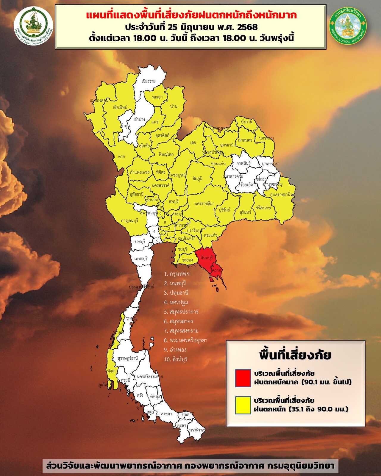 วันที่ 25 มิ.ย.2568 กรมอุตุนิยมวิทยา พยากรณ์อากาศ 24 ชั่วโมงข้างหน้า ประเทศไทยตอนบนมีการกระจายของฝนฟ้าคะนองเพิ่มขึ้นและมีฝนตกหนักบางแห่ง โดยมีฝนตกหนักมากบางพื้นที่ในภาคตะวันออก ขอให้ประชาชนบริเวณดังกล่าวระวังอันตรายจากฝนตกหนักถึงหนักมากและฝนที่ตกสะสม ซึ่งอาจทำให้เกิดน้ำท่วมฉับพลัน น้ำป่าไหลหลากและดินโคลนถล่ม โดยเฉพาะพื้นที่ลาดเชิงเขาใกล้ทางน้ำไหลผ่านและพื้นที่ลุ่ม