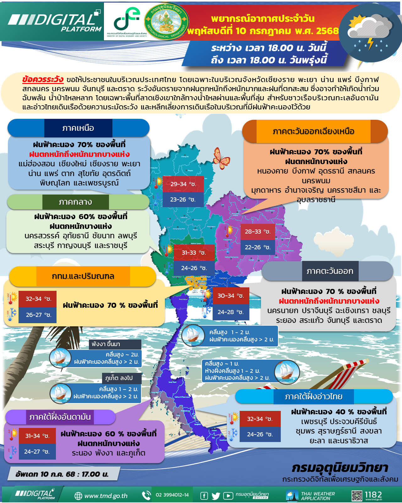 วันที่ 10 ก.ค.2568 กรมอุตุนิยมวิทยา พยากรณ์อากาศ 24 ชั่วโมงข้างหน้า ประเทศไทยยังคงมีฝนตกหนักบางแห่ง โดยมีฝนตกหนักมากบางแห่งบริเวณภาคเหนือ และภาคตะวันออก ขอให้ประชาชนในบริเวณประเทศไทย