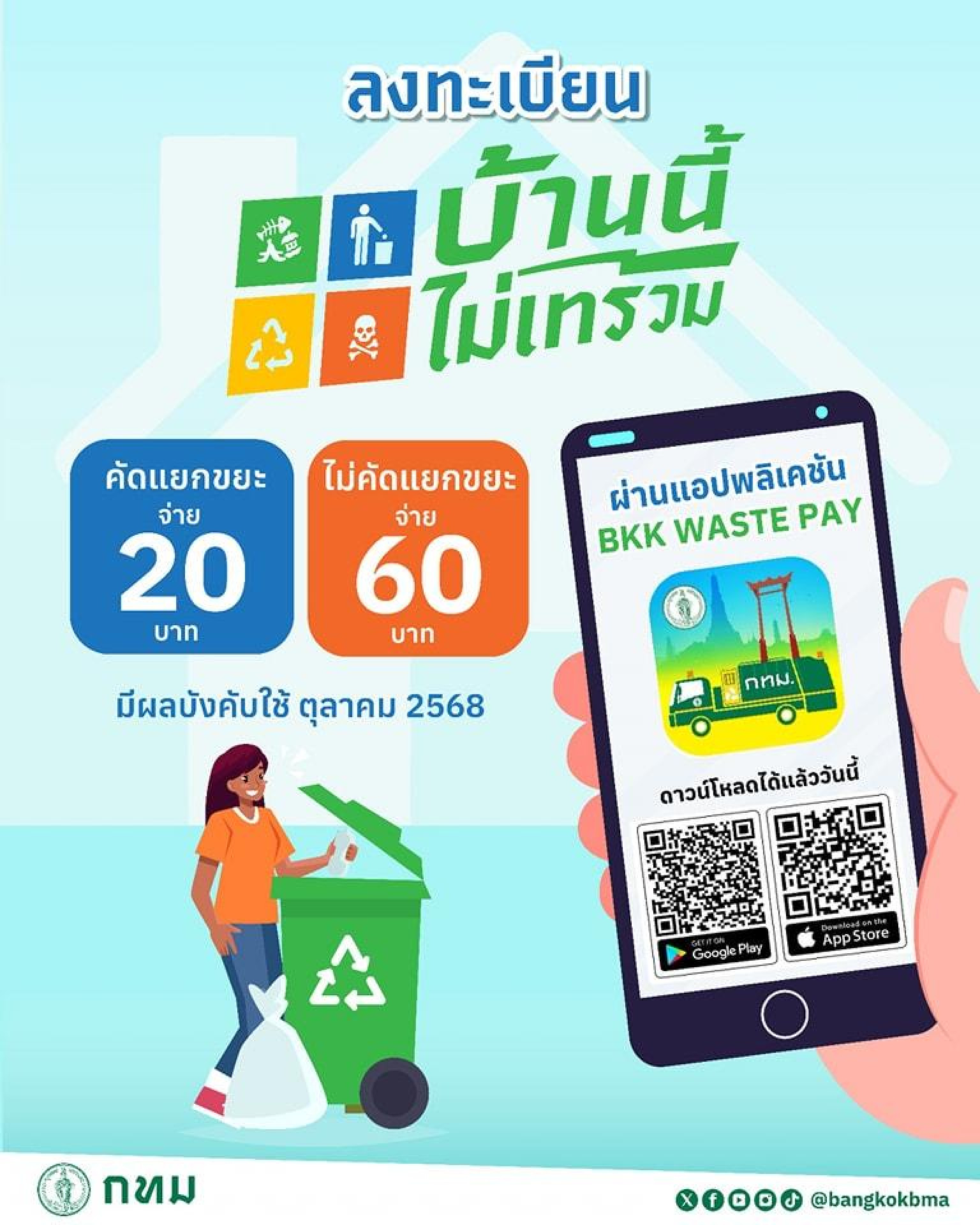 เพียงแค่เริ่มแยกขยะจากบ้านของคุณ ก็ช่วยลดค่าธรรมเนียมการจัดการขยะได้ทันที พร้อมช่วยสิ่งแวดล้อมอย่างยั่งยืน หากบ้านคุณแยกขยะครบตามเกณฑ์ จะจ่ายค่าธรรมเนียมเพียง 20 บาท/เดือน เท่าเดิม แต่ถ้าไม่แยก อัตราใหม่จะพุ่งสูงถึง 60 บาท/เดือน หรือมากกว่านั้นตามปริมาณขยะ ซึ่งกรุงเทพมหานครได้เชิญชวนประชาชนเข้าร่วมโครงการ “บ้านนี้ไม่เทรวม แยกขยะลดค่าธรรมเนียม” ผ่านแอปพลิเคชัน BKK WASTE PAY ซึ่งผู้ร่วมโครงการจะได้รับสิทธิ์จ่ายค่าขยะเพียง 20 บาท/เดือน สำหรับบ้านทั่วไปที่มีขยะไม่เกิน 20 ลิตรต่อวัน จากอัตราปกติ 60 บาท