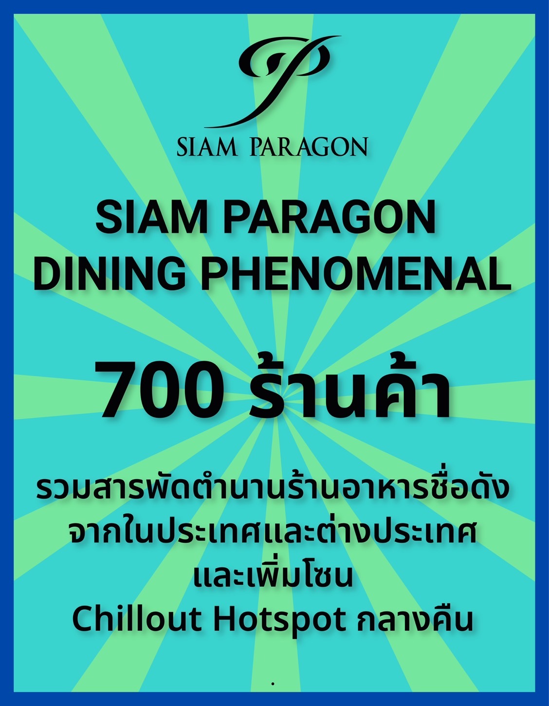 นอกจากนี้แม่เหล็กตัวสุดท้ายที่จะเสริมให้สยามพารากอนยังคงครองความเป็นที่หนึ่งในใจของลูกค้าทั้งชาวไทยและจากทั่วโลก คือ Siam Paragon Dining Phenomenal โดยรวบรวม 700 ร้านอาหารร้านขนม และเครื่องดื่มชื่อดัง รวม kiosk ทั้งจากต่างประเทศ และในประเทศ Chef Table ร้าน Michelin Stars และร้านที่แจ้งเกิดครั้งแรกในประเทศไทย รวมถึงโซน“EATELIER” Dining Entertainment ที่กำลังจะเปิดใหม่ ซึ่งทั้งหมดนี้เป็นส่วนหนึ่งของการทรานฟอร์มสยามพารากอนครั้งยิ่งใหญ่ในโอกาสเปิดดำเนินการครบรอบ 20 ปี