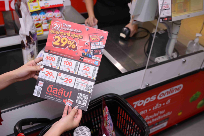 · เพียงช้อปครบทุก 600 บาท ที่ท็อปส์ ฟู้ด ฮอลล์, ท็อปส์, ท็อปส์ ออนไลน์, ท็อปส์แคร์ (TOPS CARE), เพ็ทแอนด์มี (PET N’ME) หรือ ช้อปครบทุก 100 บาท ที่ท็อปส์ เดลี่ รับทันทีสมุดคูปองส่วนลด 1 ใบ ที่มอบส่วนลด ทั้งตะกร้าสูงสุด 29% จากแบรนด์พันธมิตรชั้นนำกว่า 119 แบรนด์ เสริมส่วนลดเพิ่มเติม ด้วยคูปองส่วนลด On-Top ทั้งตะกร้า รวมมูลค่าสูงสุด 450 บาท โดยสามารถรับคูปองฉลอง 29 ปี ได้ที่จุดบริการทุกสาขา