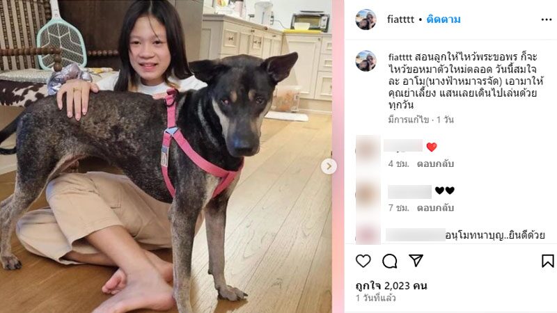 พร้อมระบุข้อความว่า"สอนลูกให้ไหว้พระขอพร ก็จะไหว้ขอหมาตัวใหม่ตลอด วันนี้สมใจละ อาโม (นางฟ้าหมาจรจัด) เอามาให้คุณย่าเลี้ยง แสนเลยเดินไปเล่นด้วยทุกวัน"