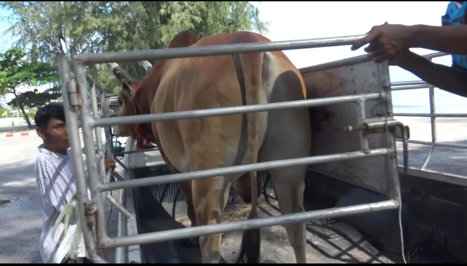 ซึ่งคอกวัวชนบางคอกที่อยู่ไกลออกไปจากชายหาดมาก ก็จะใช้วิธีนำวัวชน 2 ตัวบรรทุกรถกระบะที่ทำขึ้นมาเฉพาะเพื่อบรรทุกวัวชนเท่านั้น ทำเป็นรั้วเหล็กกั้นเป็น 2 คอก เพื่อที่จะสามารถบรรทุกวัวได้ 2 ตัว โดยขับรถบรรทุกวัวชน 2 ตัวจากคอก นำมาลงเดินบริเวณชายหาดริมทะเล เมื่อเดินเสร็จก็ให้วัวพักกินน้ำให้หายเหนื่อย หลังจากนั้นต้อนวัวชนทั้งสองตัวขึ้นรถเดินทางกลับคอก โดยจะนำวัวชนออกมาเดินออกกำลังกายระหว่างเตรียมตัวแข่งขันทุกวันก่อนที่จะลงแข่งขันจริงเพื่อให้ร่างกายมีความแข็งแกร่ง เนื่องจากการชนวัวแต่ละครั้งจะมีเดิมพันติดปลายเขาวัวด้วย