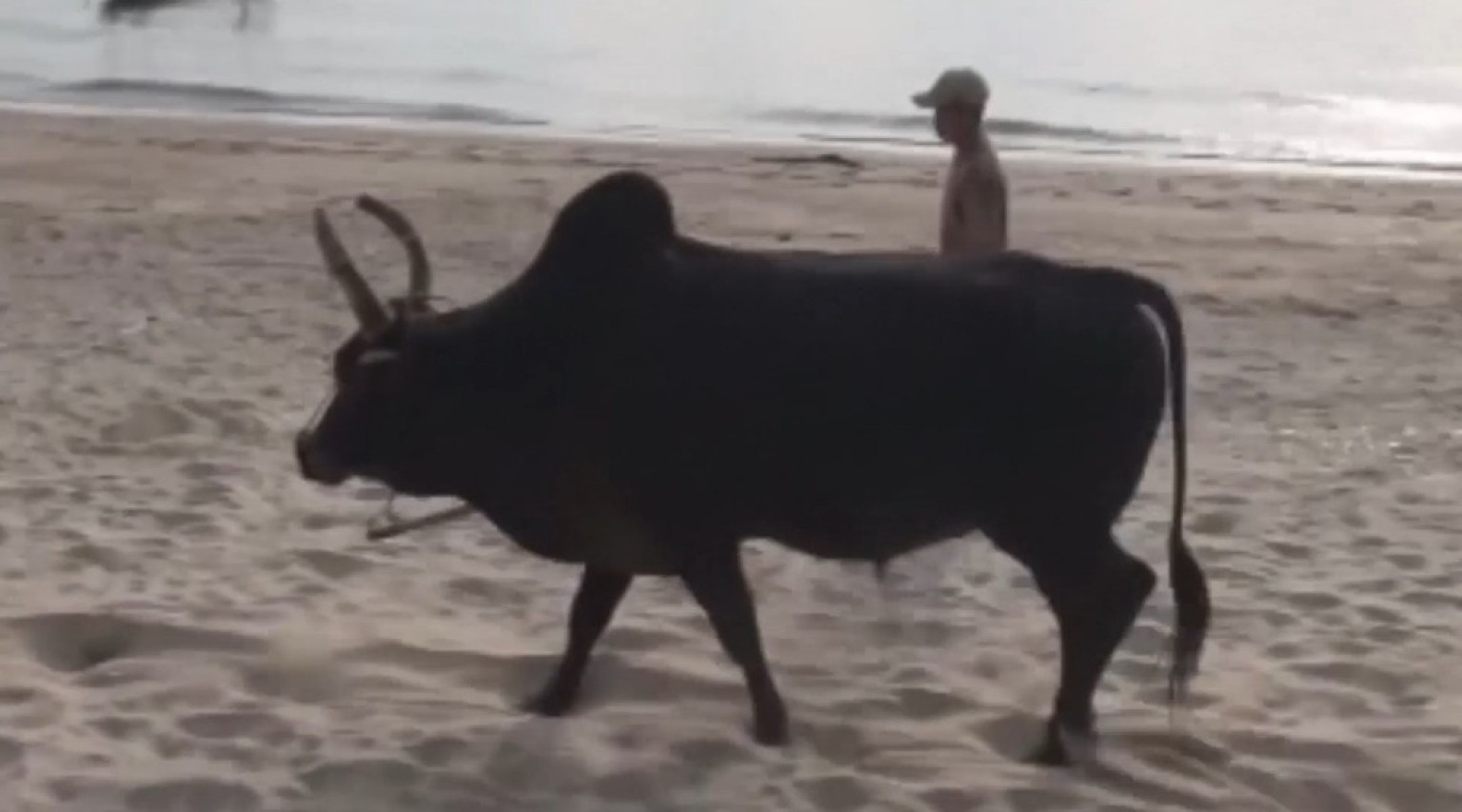 เจ้าของวัวชนจ.สงขลา นำวัวมาเดินออกกำลังกายช่วงเช้าบนผิวทรายชายหาดริมทะเล สร้างความแข็งแกร่งกล้ามเนื้อวัวชน