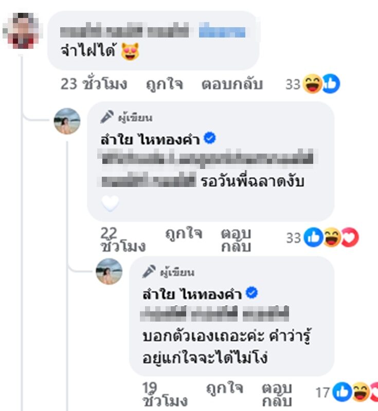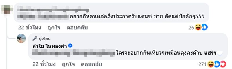 งานนี้ไม่วายเจอคอมเมนต์เข้ามาแซะนักร้องสาวด้วยว่า “อยากกินคนหล่อถึงประกาศรับแดนซ์ชายคัดแต่บักคักๆ” ด้านสาว ลำไย ก็ไม่ปล่อยผ่านขอฟาดกลับอย่างแซ่บว่า “ใครจะอยากกินเหี่ยวๆเหมือนลุงละค้าบ แฮร่ๆ” แถมยังตอบแซ่บถึงคนที่มาบอกว่าจำไฝได้ด้วย