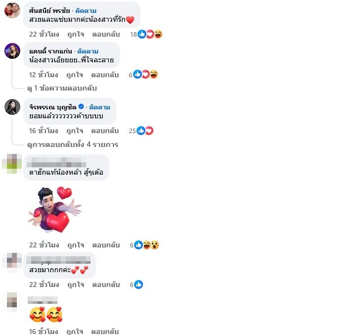 เพื่อนๆ ทั้ง อาม ชุติมา หรือ มาดามชูตี้ก็ส่งอิโมจิหัวใจดวงโตมาให้ , บัวผัน ทังโส ก็คอมเมนต์ของแท้ , เนสกาแฟ ศรีนคร ก็ลั่นแซ่บมาก แถมทำ แคนดี้ รากแก่น ใจละลายบอกว่า น้องสาวเอ๊ยยยย..พี่ใจละลาย เป็นต้น รวมทั้งแฟนๆเข้ามาคอมเมนต์ความแซ่บกันสนั่นโพสต์มาก