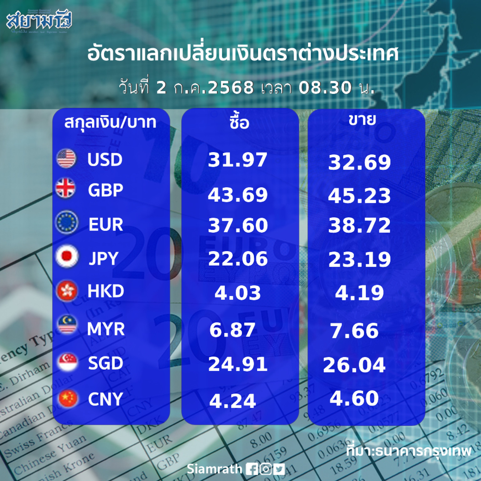 วันที่ 2 ก.ค.68 ผู้สื่อข่าวรายงานอัตราแลกเปลี่ยนเงินตราต่างประเทศ ประจำวันที่ 2 ก.ค.68 ว่า อัตราแลกเปลี่ยนเงินบาทเป็นสกุลเงินตราต่างๆ ตามเวลา 08.30 น. (ตามตารางประกอบข้างล่าง) โดยเงินดอลลาร์สหรัฐรับซื้อ 31.97 บาทต่อดอลลาร์สหรัฐ ขายออก 32.69 บาทต่อดอลลาร์สหรัฐ
