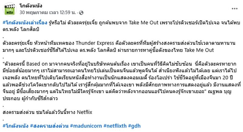 “ตัวละครรุ่ยเจี๋ย หัวหน้าทีมเทคของ Thunder Express คือตัวละครที่ทีมผู้สร้างสงครามส่งด่วนใช้เวลาตามหานานมากๆ และโปรดิวเซอร์ซีรีส์ได้ไปเจอ ดร.พลัง โลกศิลป์ ผ่านรายการหาคู่ชื่อดังของไทย Take Me Out ”
