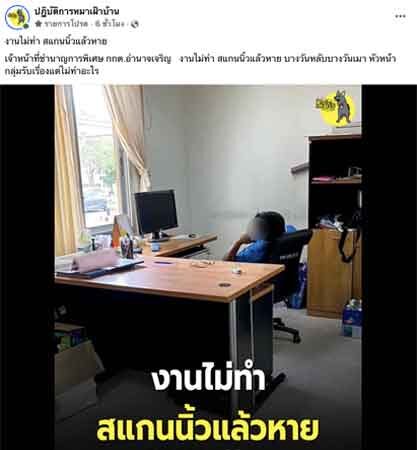 จากกรณีที่เพจปฏิบัติการหมาเฝ้าบ้าน ได้โพสต์ภาพคล้ายกับเจ้าหน้าที่รายหนึ่ง นั่งเอนหลังภายในห้องทำงาน พร้อมข้อความระบุว่า "งานไม่ทำ สแกนนิ้วแล้วหาย เจ้าหน้าที่ชำนาญการพิเศษ กกต.อำนาจเจริญ งานไม่ทำ สแกนนิ้วแล้วหาย บางวันหลับบางวันเมา หัวหน้ากลุ่มรับเรื่องแต่ไม่ทำอะไร" จนกลายเป็นที่วิพากษ์วิจารณ์ในโซเชียล