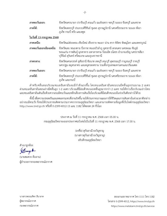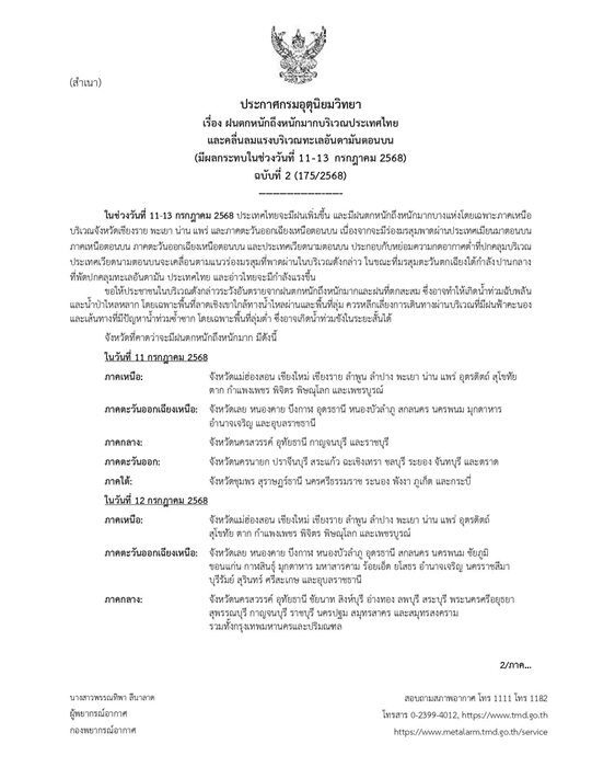 วันที่ 11 ก.ค.2568 กรมอุตุนิยมวิทยา ประกาศ เรื่อง ฝนตกหนักถึงหนักมากบริเวณประเทศไทย และคลื่นลมแรงบริเวณทะเลอันดามันตอนบน (มีผลกระทบในช่วงวันที่ 11-13 กรกฎาคม 2568) ฉบับที่ 2 (175/2568) ระบุว่า