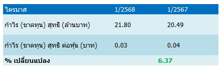 บริษัทฯ มีกำไรสุทธิสำหรับงวดไตรมาสปัจจุบันเป็นจำนวน 21.80 ล้านบาท เพิ่มขึ้น 1.31 ล้านบาท หรือคิดเป็นร้อยละ 6.39 จากงวดเตียวกันในปี 67 และเพิ่มขึ้นจากไตรมาสก่อนหน้าจำนวน 3.03 ล้านบาท หรือคิดเป็นอัตราการเติบโตร้อยละ 16.14 ซึ่งเป็นไปในทิศทางเดียวกันกับรายได้ที่เพิ่มขึ้น ในขณะที่ต้นทุนในการจัดจำหน่ายและค่าใช้จ่ายในการบริหารนั้นค่อนข้างคงที่เปรียบเทียบกับไตรมาสก่อนหน้า และเพิ่มขึ้นเล็กน้อยจากงวดเดียวกันในปี 67 ซึ่งเป็นผลจากการควบคุมงบประมาณได้อย่างมีประสิทธิภาพของทางบริษัทฯ ทำให้อัตรากำไรสุทธิของงวดปัจจุบันอยู่ที่ร้อยละ 12.26 ใกล้เคียงกับงวดไตรมาส 4/67 และลดลงร้อยละ 2.49 จากไตรมาส 1/67