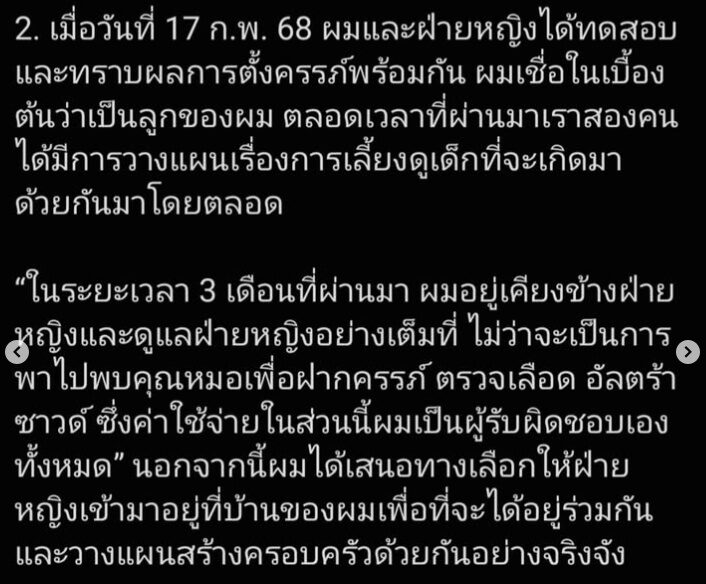 พร้อมทั้งยืนยันว่า 3 เดือนที่ผ่านมาอยู่เคียงข้างดูแลฝ่ายหญิงอย่างเต็มที่ พาไปฝากครรภ์ ตรวจเลือด อัลตราซาวด์ และรับผิดชอบค่าใช้จ่ายเองทั้งหมด และยังเสนอให้ฝ่ายหญิงเข้ามาอยู่ในบ้าน