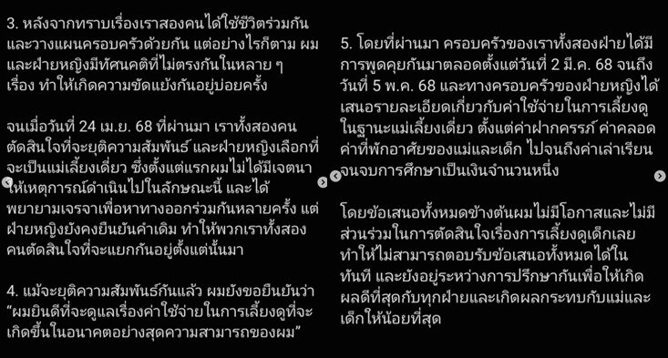 “โดยข้อเสนอทั้งหมดข้างต้นผมไม่มีโอกาสและไม่มีส่วนร่วมในการตัดสินใจเรื่องการเลี้ยงดูเด็กเลย ทำให้ไม่สามารถตอบรับข้อเสนอทั้งหมดได้ในทันที และยังอยู่ระหว่างการปรึกษากันเพื่อให้เกิดผลดีที่สุดกับทุกฝ่าย และเกิดผลกระทบกับแม่และเด็กให้น้อยที่สุด”