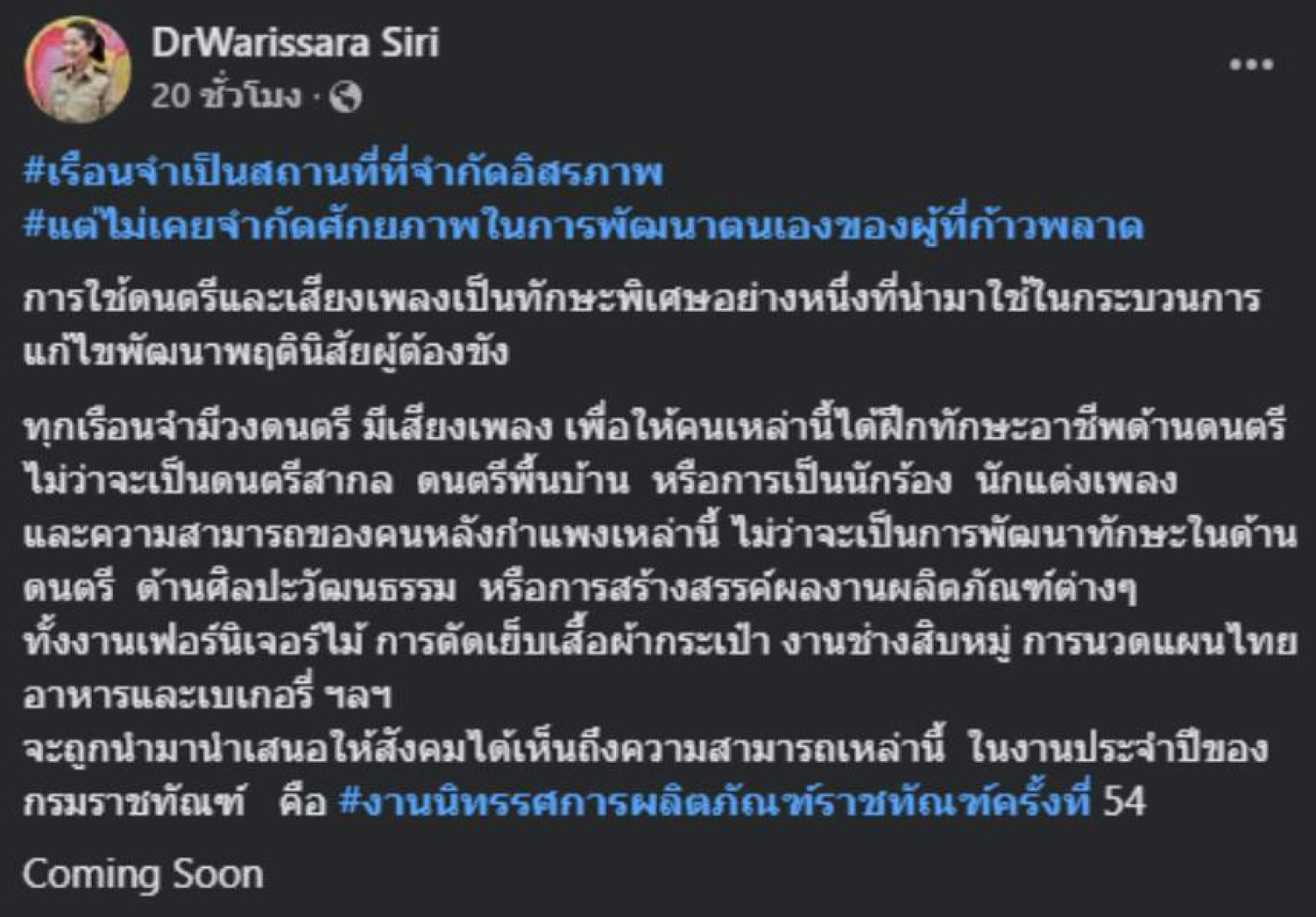 ล่าสุด เมื่อวานนี้ (10 มิ.ย.68) ดร.วริศรา ศิริสุทธิเดชา ผอ.กองพัฒนาพฤตินิสัย โพสต์ภาพ เสก โลโซ ได้รวมเล่นดนตรีกับผู้ต้องขังคนอื่น ผ่านเฟซบุ๊กส่วนตัว DrWarissara Siri พร้อมระบุข้อความว่า…