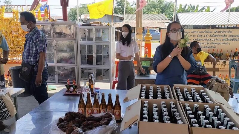 แห่กราบไหว้ หลวงพ่อเคลือบ กระซิบข้างหูขอโชคลาภ ช่วงวันหยุดยาว หญิงนำเหล้าขาว 99 ขวด แก้บน