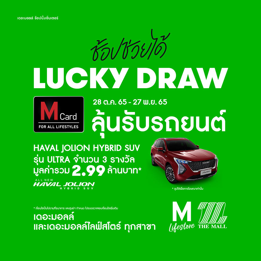 - Lucky Draw พิเศษ ลุ้นรับรถยนต์ GWM รุ่น HAVAL JOLION จำนวน 3 รางวัล รวมมูลค่า 2.99 ล้านบาท เมื่อช้อปภายในศูนย์ฯ และห้างฯ ครบทุก 2,000 บาท