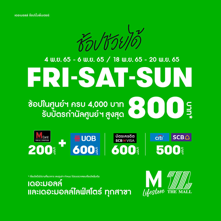 ศูนย์การค้า เดอะมอลล์ และ เดอะมอลล์ไลฟ์สโตร์ ทุกสาขา ร่วมกับพันธมิตรธุรกิจ ธนาคารยูโอบี ประเทศไทย , ธนาคารไทยพาณิชย์ จำกัด (มหาชน) และ ธนาคารซิตี้แบงก์ ประเทศไทย จัดแคมเปญใหญ่ “The Mall Shopping Center Bangkok Shopping Festival 2022” มอบโปรโมชั่นพิเศษ ช้อป ช่วย ได้มากมาย ช้อปร้านค้าในศูนย์การค้า อาทิ BANANA, EVEANDBOY, H&M, JASPAL, JD SPORTS, MUJI, SPARSHA, STUDIO7, THE KLINIQUE และ UNIQLO ระหว่างวันที่ 28 ตุลาคม – 27 พฤศจิกายน 2565 ที่ ศูนย์การค้า เดอะมอลล์ และ เดอะมอลล์ไลฟ์สโตร์ ทุกสาขา