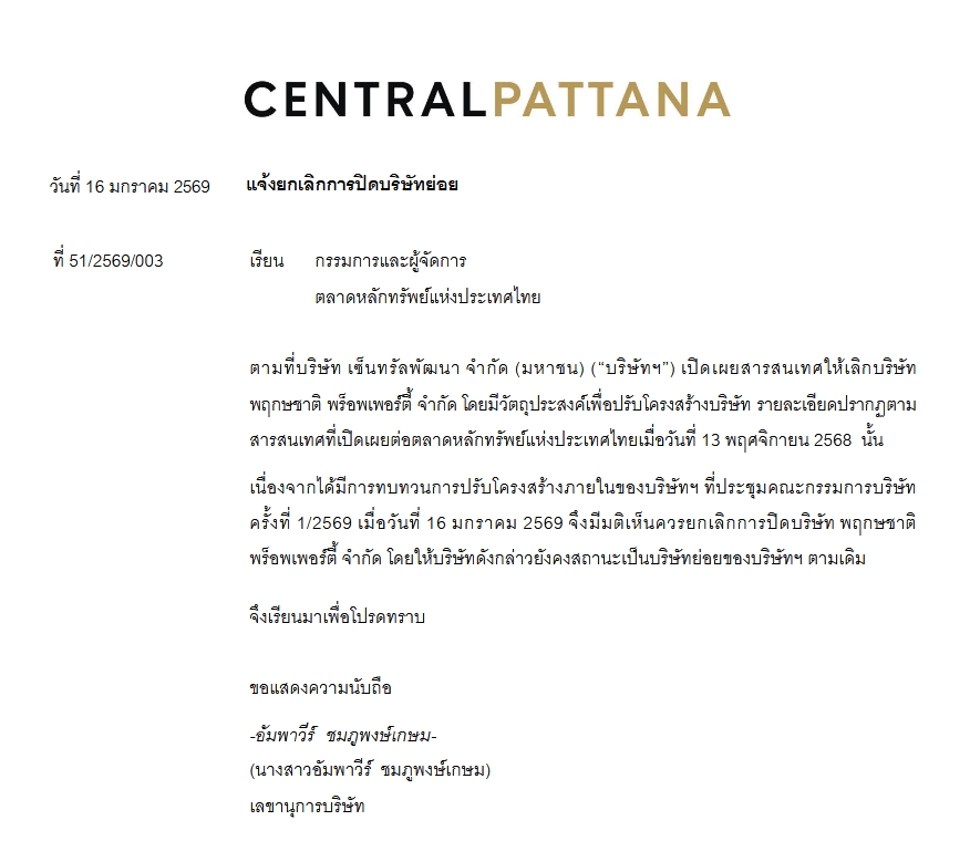 CPN แจ้งตลาดหลักทรัพย์ฯ บอร์ดมีมติทบทวนการปิด “พฤกษชาติ พร็อพเพอร์ตี้” คงสถานะบริษัทย่อยตามเดิม พร้อมมีมติแต่งตั้ง “ชนวัฒน์ เอื้อวัฒนะสกุล” นั่งแท่นกรรมการผู้จัดการใหญ่และประธานเจ้าหน้าที่บริหาร แทน “วัลยา จิราธิวัฒน์” มีผล 1 พ.ค. 69