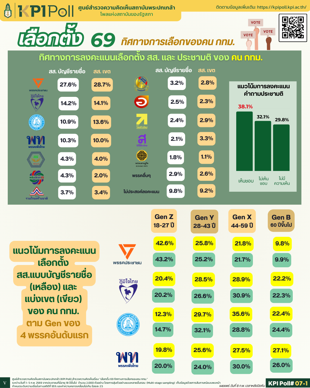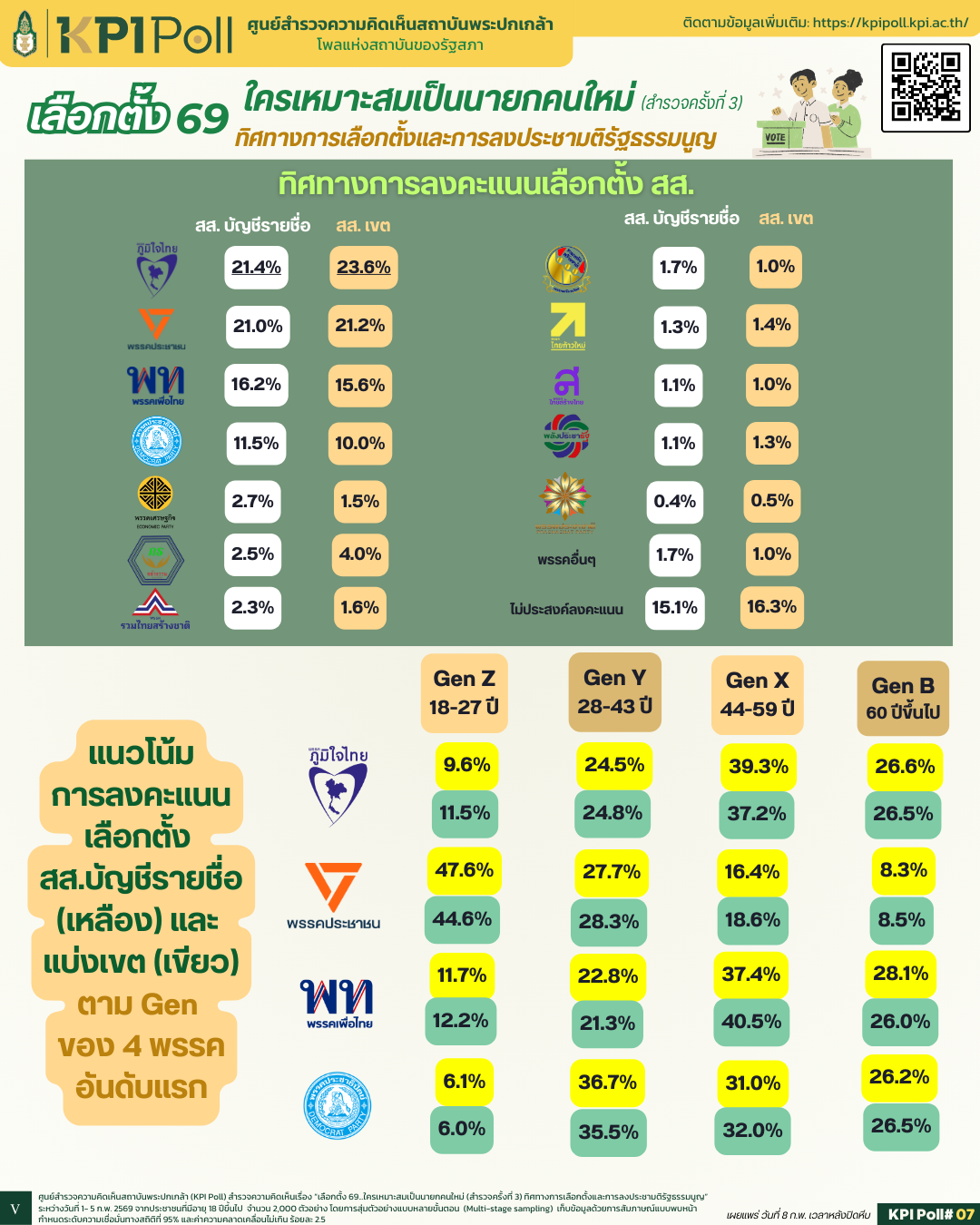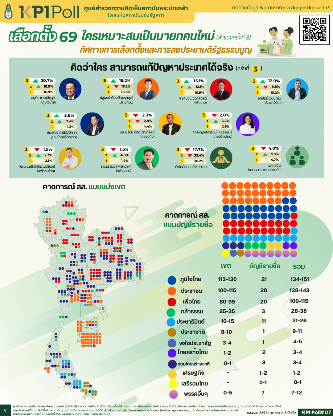 สถาบันพระปกเกล้า เปิดเผยผลสำรวจ เรื่อง “เลือกตั้ง 69…ใครเหมาะสมเป็นนายกคนใหม่ (สำรวจครั้งที่ 3) ทิศทางการเลือกตั้งและการลงประชามติรัฐธรรมนูญ” โดยได้ทำการสำรวจ ระหว่างวันที่ 30 ม.ค.-5 ก.พ. 2569 จากประชาชนที่มีอายุ 18 ปีขึ้นไป กระจายตามภูมิภาคทั่วประเทศ จำนวน 2,000 ตัวอย่าง (ภาพรวมและกรุงเทพมหานคร) และ จังหวัดละ 400 ตัวอย่าง ใน 4 จังหวัด