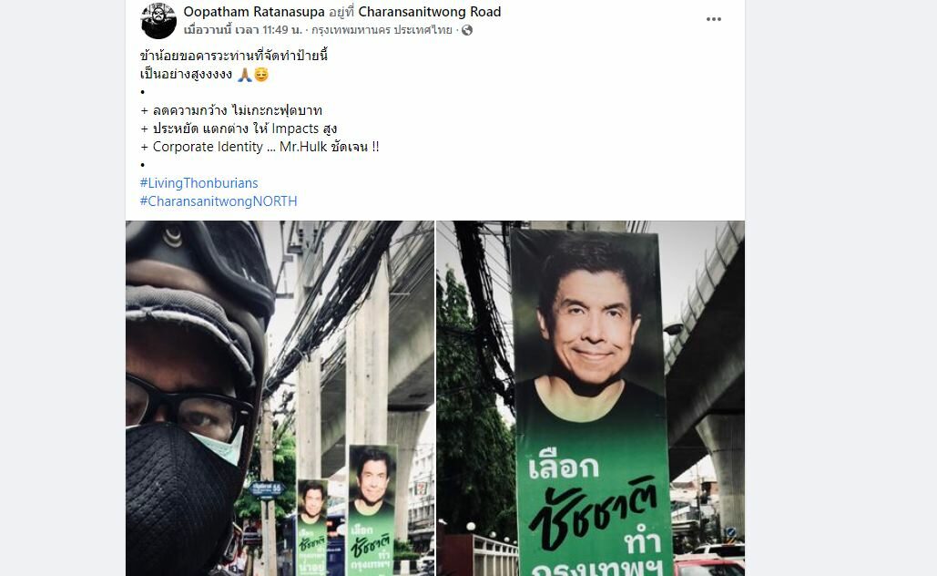 ล่าสุดสมาชิกเฟซบุ๊กOopatham Ratanasupa ได้แชร์ภาพป้ายการหาเสียงของ นายชัชชาติ ซึ่งออกแบบให้กระทบต่อคนเมืองน้อยที่สุด โดยใช้ป้ายขนาดเล็กลง ซึ่งป้ายที่ถูกแชร์ไปนับหมื่นครั้งนี้ มีขนาดเท่าเสาไฟ ซึ่งเล็กกว่าป้ายขนาดปกติที่ผู้สมัครรายอื่นใช้กัน