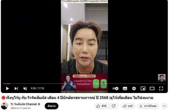 เตือนสถานการณ์ปี 2568ริว จิตสัมผัส เผยคลิป “ฟังหูไว้หู กับ ริวจิตสัมผัส เตือน 4 ปีนักษัตรสถานการณ์ ปี 2568 ดูไว้เพื่อเตือน ไม่ใช่งมงาย”