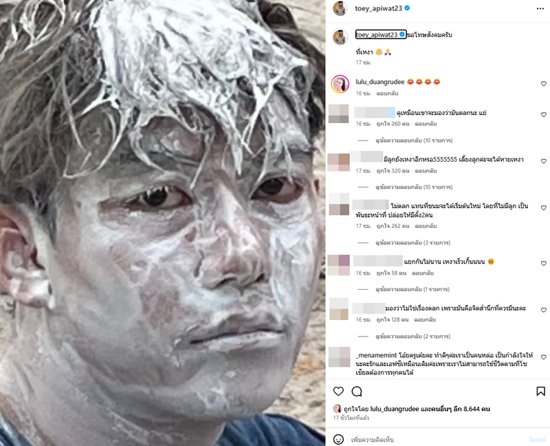 ล่าสุด ครูเต้ย ได้โพสต์ภาพหน้าตนเองขาวเต็มไปด้วยแป้ง พร้อมแคปชั่นว่า “ขอโทษสังคมครับ ที่เหงา” ซึ่งก็มีแฟนคลับหลายคนเข้ามาคอมเมนต์บอกผิดหวังในตัวครูเต้ย และไม่ตลกด้วย อาทิ