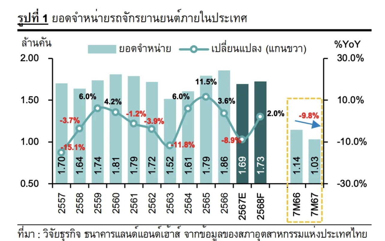 อ้างอิงข้อมูลศูนย์วิจัยธนาคารแลนด์ แอนด์ เฮ้าส์ ระบุ ยอดซื้อขายรถจักรยานยนต์ช่วง 7 เดือนแรก (ม.ค. - ก.ค.) ปีนี้ อยู่ที่ 1.03 ล้านคัน ลดลง 9.8% (YoY) จากช่วงเดียวกันของปีก่อนที่ขายได้ 1.14 ล้านคัน