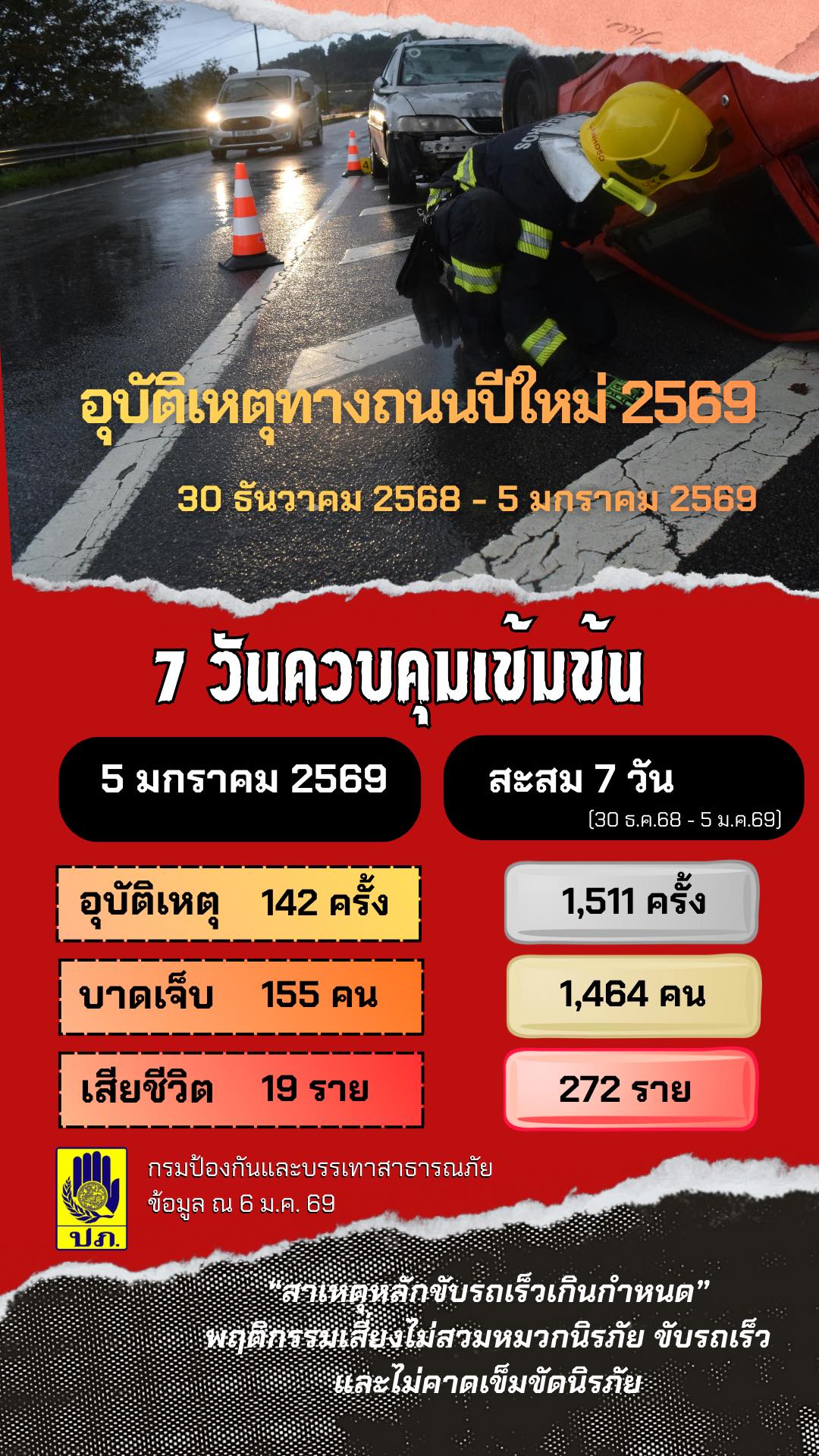 ศูนย์อำนวยการป้องกันและลดอุบัติเหตุทางช่วงเทศกาลปีใหม่ พ.ศ. 2569 เปิดเผยสถิติอุบัติเหตุทางถนน ประจำวันที่ 5 มกราคม 2569 ซึ่งเป็นวันที่เจ็ดของการรณรงค์ “ขับขี่ปลอดภัย ลดความเร็ว ลดอุบัติเหตุ” เกิดอุบัติเหตุ 142 ครั้ง ผู้บาดเจ็บ 155 คน ผู้เสียชีวิต 19 ราย สาเหตุที่ทำให้เกิดอุบัติเหตุสูงสุด ได้แก่ ขับรถเร็วเกินกำหนด ร้อยละ 39.44 ตัดหน้ากระชั้นชิด ร้อยละ 20.42