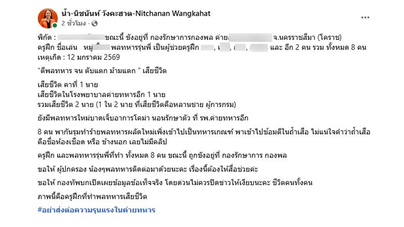 วันที่ 14 ม.ค. 2569 เฟซบุ๊ก น้ำ-นิชนันท์ วังคะฮาต อดีตผู้สมัคร สส.ชลบุรี เขต 10 พรรคก้าวไกล โพสต์ระบุว่า เหตุเกิดที่ค่ายทหารแห่งหนึ่ง ใน จ.นครราชสีมา เมื่อวันที่ 12 มกราคม 2569 พลทหารรุ่นพี่เป็นผู้ช่วยครูฝึก รวมทั้งหมด 8 คน