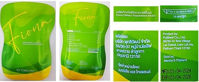 2."ผลิตภัณฑ์เสริมอาหารฟิโอน่า อย. 13-1-01464-5-0021 ผลิตโดย : บริษัท พุทธิวัฒน์ จำกัด จัดจำหน่ายโดย : เมอร์เซีย เอส ไทยแลนด์ MFD 01/04/2024 EXP 01/04/26"