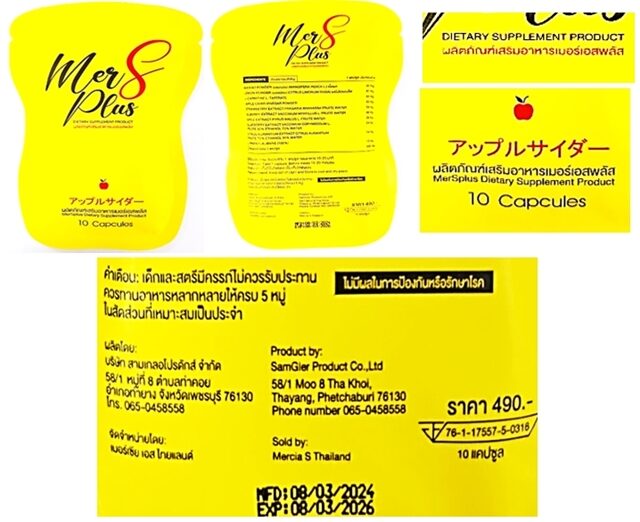1."ผลิตภัณฑ์เสริมอาหารเมอร์เอสพลัส อย. 76-1-17557-5-0316 ผลิตโดย : บริษัท สามเกลอโปรดักส์ จำกัด จัดจำหน่ายโดย : เมอร์เซีย เอส ไทยแลนด์ MFD 08/03/2024 EXP 08/03/26"
