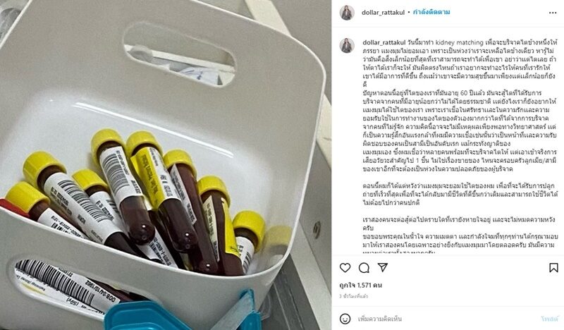 ความรักที่มีให้กับภรรยา วันที่ 19 เม.ย.65 เสธ.ดอลลาร์ โพสต์ผ่านโซเชียลล่าสุดเผยด้วยว่า วันนี้มาทำ kidney matching เพื่อจะบริจาคไตข้างหนึ่งให้ภรรยา เเมงมุมไม่ยอมเอา เพราะเป็นห่วงว่าเราจะเหลือไตข้างเดียว หารู้ไม่ว่ามันคือสิ่งเล็กน้อยที่สุดที่เราสามารถจะทำได้เพื่อเขา อย่าว่าเเต่ไตเลย ถ้าให้ตาได้เราก็จะให้ มันผิดตรงไหนถ้าเราอยากจะทำอะไรให้คนที่เรารักให้เขาได้มีอาการที่ดีขึ้น ถึงเเม้ว่าเขาจะมีความสุขขึ้นมาเพียงเเต่เเล็กน้อยก็ยังดี