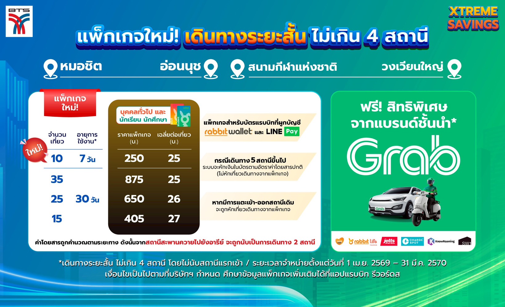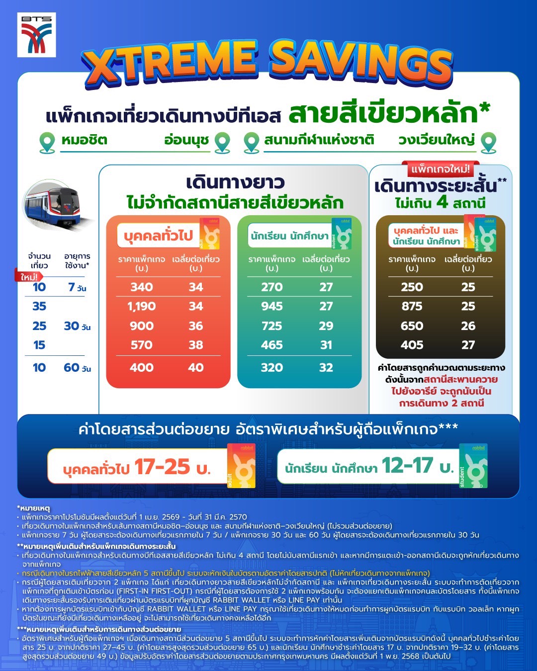 แพ็กเกจ Xtreme Savings ราคาโปรโมชันมีผลตั้งแต่วันที่ 1 เมษายน 2569 ถึงวันที่ 31 มีนาคม 2570 โดยสามารถซื้อผ่านช่องทางห้องจำหน่ายตั๋วโดยสารบีทีเอสและแอปแรบบิท รีวอร์ดส