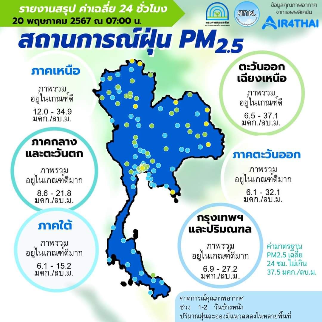 อ่านข่าวต้นฉบับได้ที่ : เช็กค่าฝุ่น PM 2.5 วันนี้ (20 พ.ค. 2567) ทั้งประเทศอากาศดีมาก-ปานกลาง