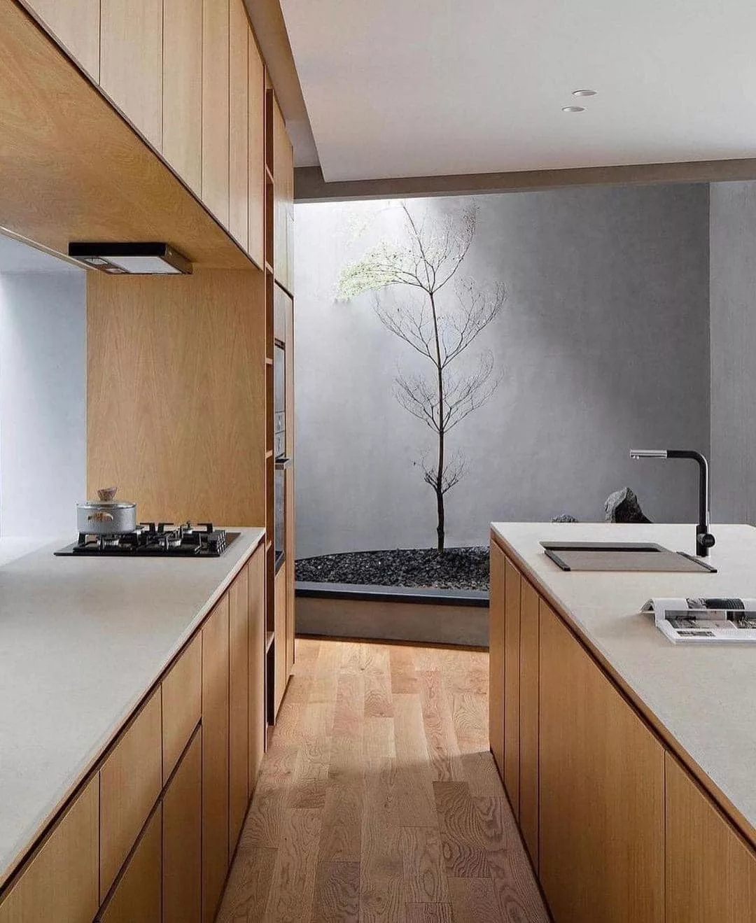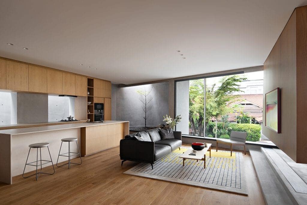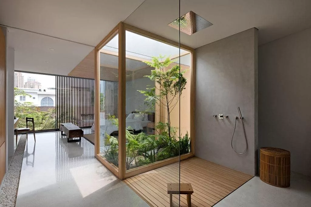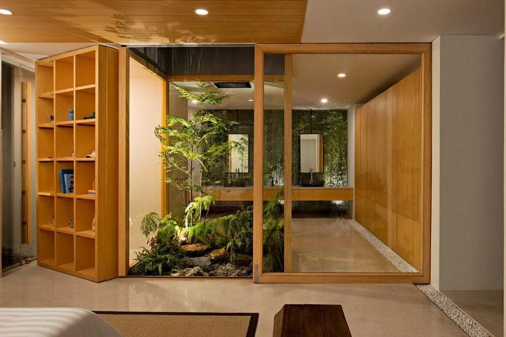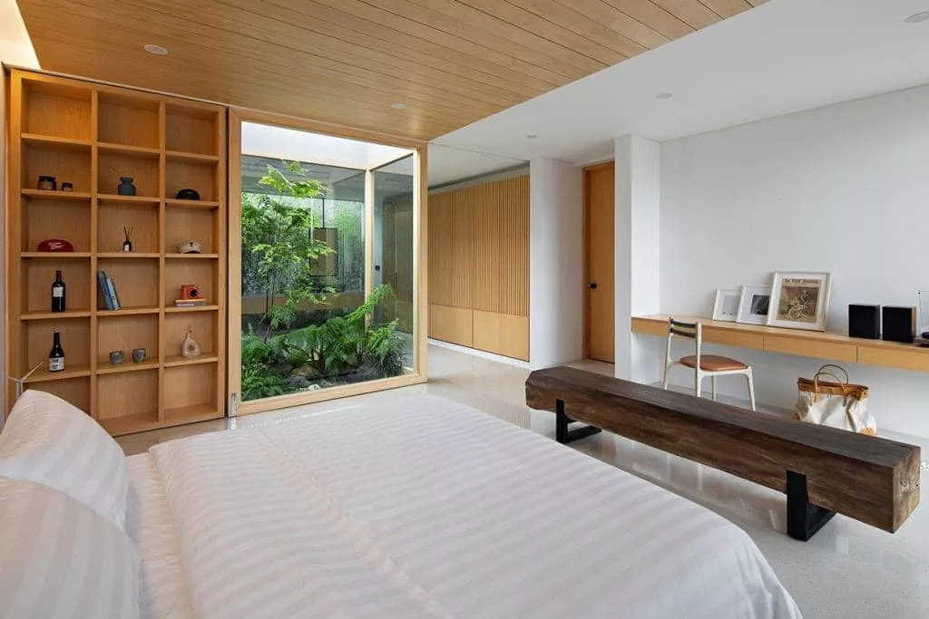 ภายในบ้านเลือกใช้เฟอร์นิเจอร์เป็นไม้โทนสีอ่อนๆ ตกแต่งเป็นหลัก ทำให้รู้สึกถึงความอบอุ่น และเรียบง่าย ส่วนเฟอร์นิเจอร์อื่นๆ ไม่ว่าจะเป็นสีดำ สีเทา หรือสีขาว ก็ตัดกันกับโทนสีในบ้านได้เป็นอย่างดี อีกทั้งยังมีการใช้กระจกบานใหญ่มาตกแต่ง ทำให้บ้านดูโปร่งสบาย รับแสงธรรมชาติเต็มอิ่ม นอกจากนี้ในห้องนอนมีการออกแบบ Courtyard ไว้ตรงกลางห้อง ทำให้ผู้อยู่อาศัย รู้สึกเหมือนได้พักผ่อนท่ามกลางธรรมชาติ พลาดไม่ได้เลยคือห้องน้ำ มีการตกแต่งด้วยหน้าต่าง Sexy bath เพิ่มความหรูหรา น่าหลงไหลแบบสุดๆ