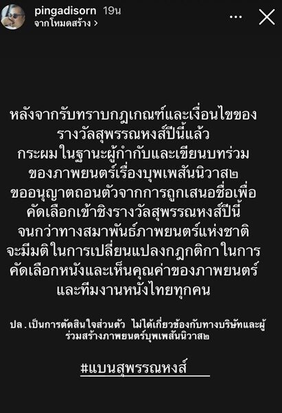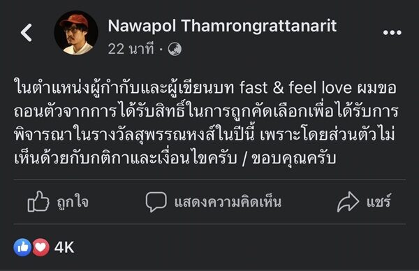 “ในตำแหน่งผู้กำกับและผู้เขียนบท fast & feel love ผมขอถอนตัว จากการได้รับสิทธิ์ในการถูกคัดเลือกเพื่อได้รับการพิจารณาในรางวัลสุพรรณหงส์ในปีนี้ เพราะโดยส่วนตัวไม่เห็นด้วยกับกติกาและเงื่อนไขครับ / ขอบคุณครับ”