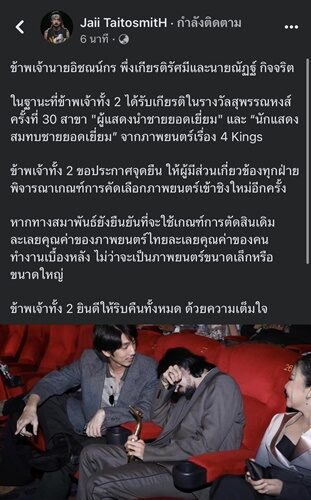 อย่างไรก็ดี จ๋าย ไททศมิตร และณัฏฐ์ กิจจริต ที่ได้รางวัลไปในการประกาศรางวัลสุพรรณหงส์ปีล่าสุดอย่าง #4Kings ก็ออกมาแสดงจุดยืนเรื่องเกณฑ์การคัดเลือกภาพยนตร์เข้าชิง และยินดีให้ทางสมาพันธ์เอารางวัลคืนไปทั้งหมดได้ด้วยความเต็มใจ