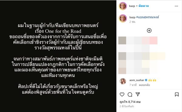 "ผมในฐานะผู้กำกับ/ทีมเขียนบทภาพยนตร์เรื่อง One for the Road ขอถอนชื่อของตัวเองจากการได้รับการเสนอชื่อเพื่อคัดเลือกเข้าชิงรางวัลผู้กำกับและผู้เขียนบทของรางวัลสุพรรณหงส์ในปีนี้
