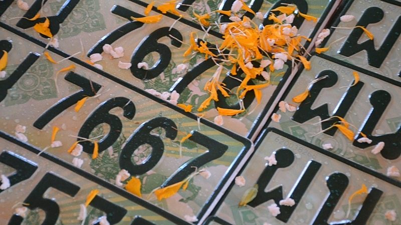 แผ่นป้ายทะเบียนที่หลวงพ่อเจริญโรยข้าวตอกดอกไม้โดนเต็มๆ