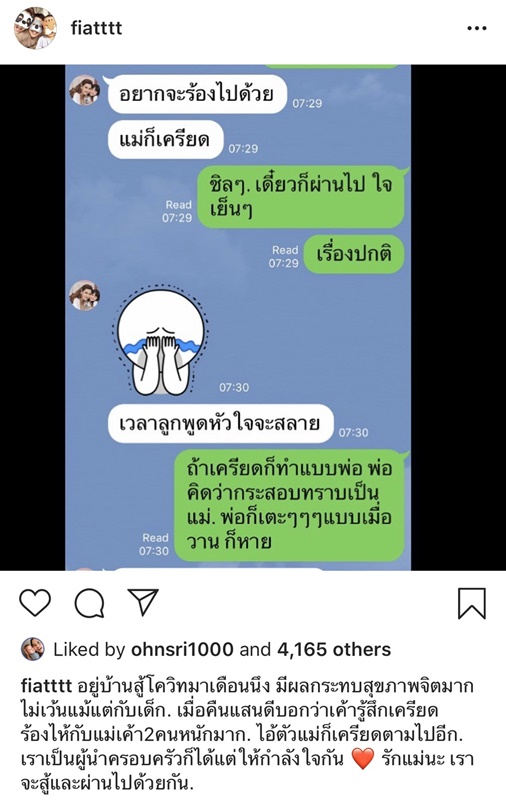 โดยระบุแคปชั่นว่า “อยู่บ้านสู้โควิดมาเดือนนึง มีผลกระทบสุขภาพจิตมาก ไม่เว้นแม้แต่กับเด็ก เมื่อคืนแสนดีบอกว่าเค้ารู้สึกเครียด ร้องไห้กับแม่เค้า 2 คนหนักมาก ไอ้ตัวแม่ก็เครียดตามไปอีก เราเป็นผู้นำครอบครัวก็ได้แต่ให้กำลังใจกัน ❤️ รักแม่นะ เราจะสู้และผ่านไปด้วยกัน”