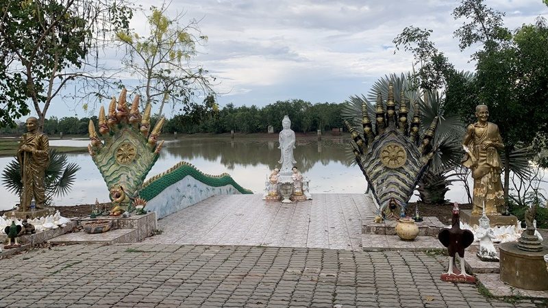 รวมทั้งรูปปั้นของสิ่งศักดิ์สิทธิ์ต่างๆ ตั้งอยู่ข้างบันไดลงไปสู่บ่อโบราณ มีศาลาซึ่งภายในมีพระประธานและสิ่งของเครื่องใช้ต่าง ๆ วางอยู่ประตูศาลาถูกล็อคกุญแจเอาไว้ ห่างออกไปประมาณ 100 เมตร พบบ้านลักษณะคล้ายกับกุฏิพระตั้งอยู่ริมหนองน้ำ แต่ ประตูห้องถูกล็อกกุญแจไว้เช่นกัน ซึ่งที่กุฏิแห่งนี้เป็นสถานที่ถูกอ้างว่า มีสาวมาปฏิบัติธรรมแล้วอ้างถูกชายชุดดำลวนลามทางเพศ