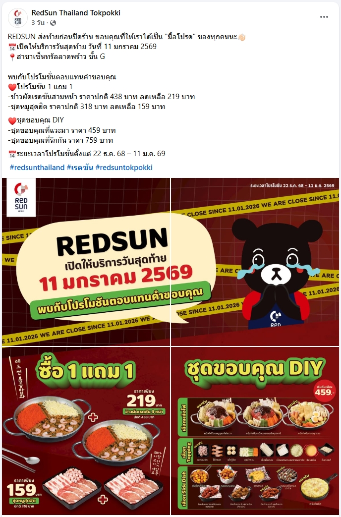 RedSun ร้านอาหารเกาหลี ประกาศปิดสาขาสุดท้ายที่เซ็นทรัลลาดพร้าว โดยเปิดจนถึง 11 มกราคม 2569 พร้อมจัดโปรโมชั่นส่งท้าย ขอบคุณลูกค้า ขณะที่ผลประกอบการ 5 ปีล่าสุด พบขาดทุนสะสมต่อเนื่อง