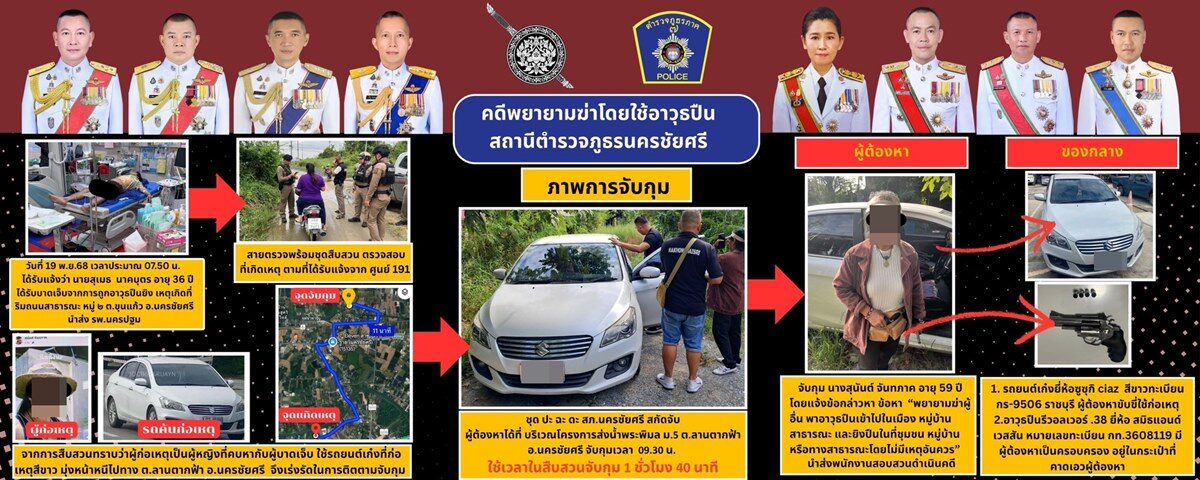 ทั้งนี้สืบเนื่องจาก เมื่อเวลา 07.50 น. วันที่ 19 พ.ย.68 สภ.นครชัยศรี รับแจ้งเหตุทำร้ายร่างกายโดยใช้อาวุธปืนยิงได้รับบาดเจ็บ ที่ถนนสาธารณะ หมู่ 2 ต.ขุนแก้ว อ.นครชัยศรี ตรวจที่เกิดเหตุ พบ นายสุเมธ (สงวนนามสกุล) อายุ 36 ปี สามีของนางสุนันท์ มือปืน ถูกยิงเข้าที่ลำตัว 1 นัด และที่ต้นขาขวา 1นัด บาดเจ็บสาหัส นอนร้องครวญครางอยู่ที่เกิดเหตุ ตร.จึงนำตัวส่ง ร.พ.นครชัยศรี