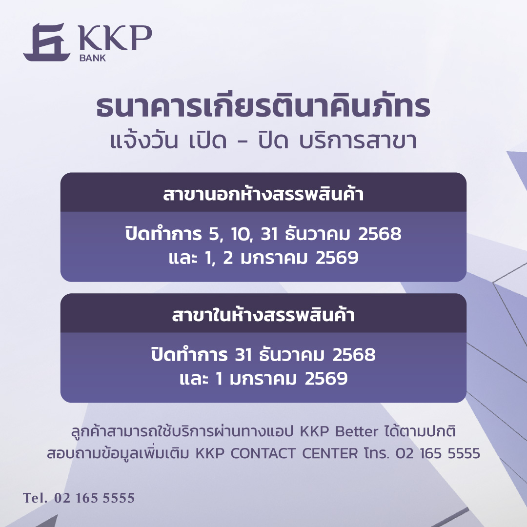 ธนาคารเกียรตินาคินภัทร แจ้งวันปิดทำการสาขา ในช่วงเทศกาลปีใหม่ 2569 ดังนี้