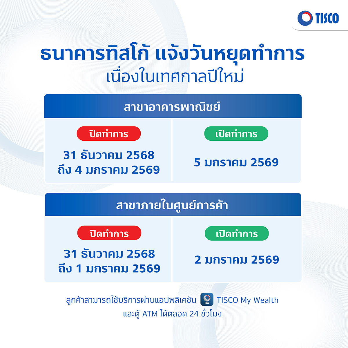 ธนาคารทิสโก้ แจ้งวันปิดทำการสาขา ในช่วงเทศกาลปีใหม่ 2569 ดังนี้
