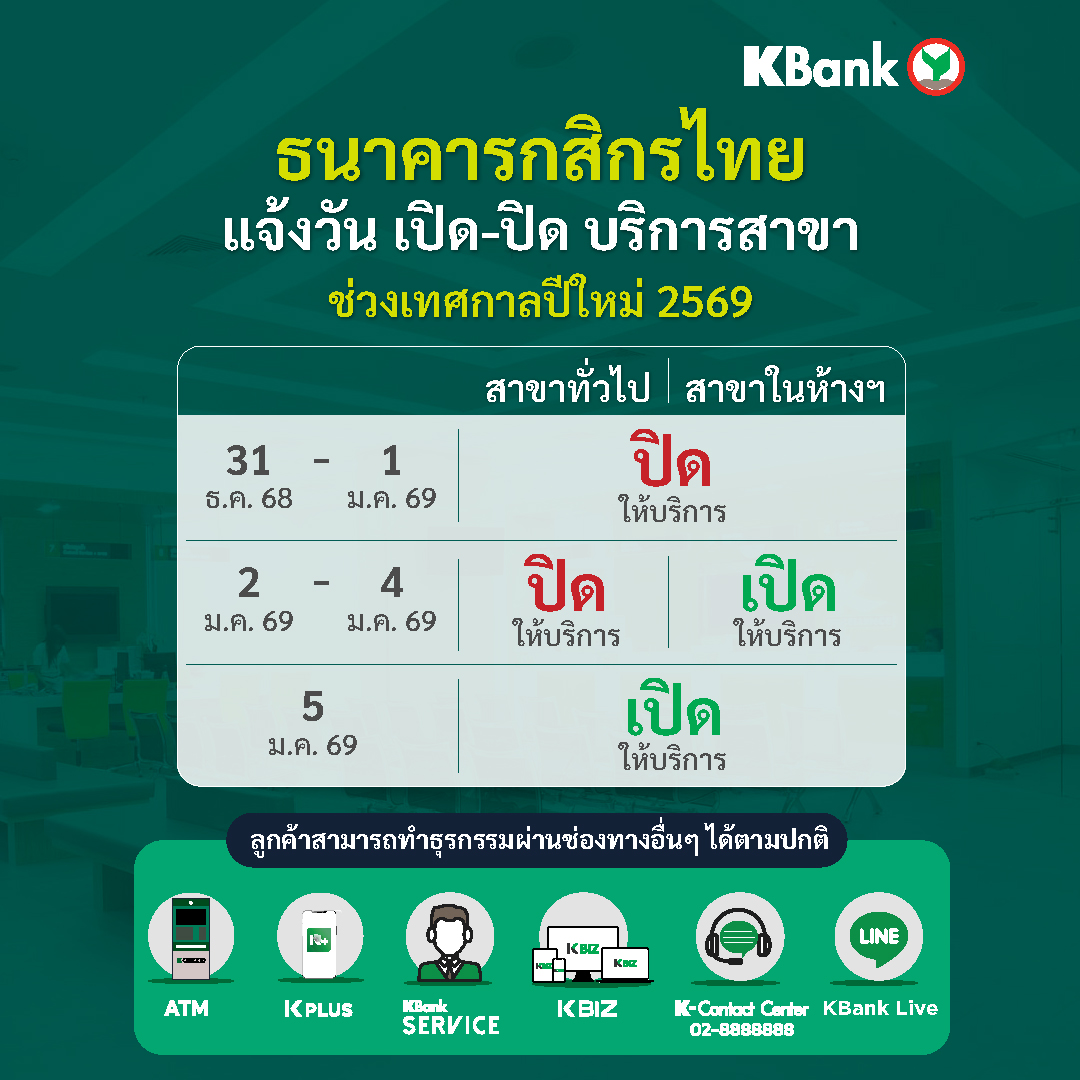 - วันที่ 31 ธ.ค. 68-1 ม.ค. 69 : ปิดทำการทั้งสาขาทั่วไป และสาขาในห้างสรรพสินค้า